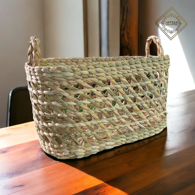 Feita à mão, esta cesta retangular é confeccionada com palha de taboa, um material natural e sustentável que transmite uma sensação de autenticidade e conexão com a natureza. Sua trama vazada permite que os alimentos respirem, mantendo-os frescos e arejados por mais tempo.